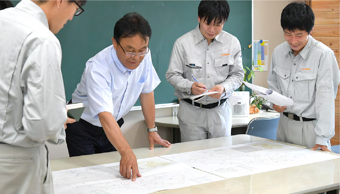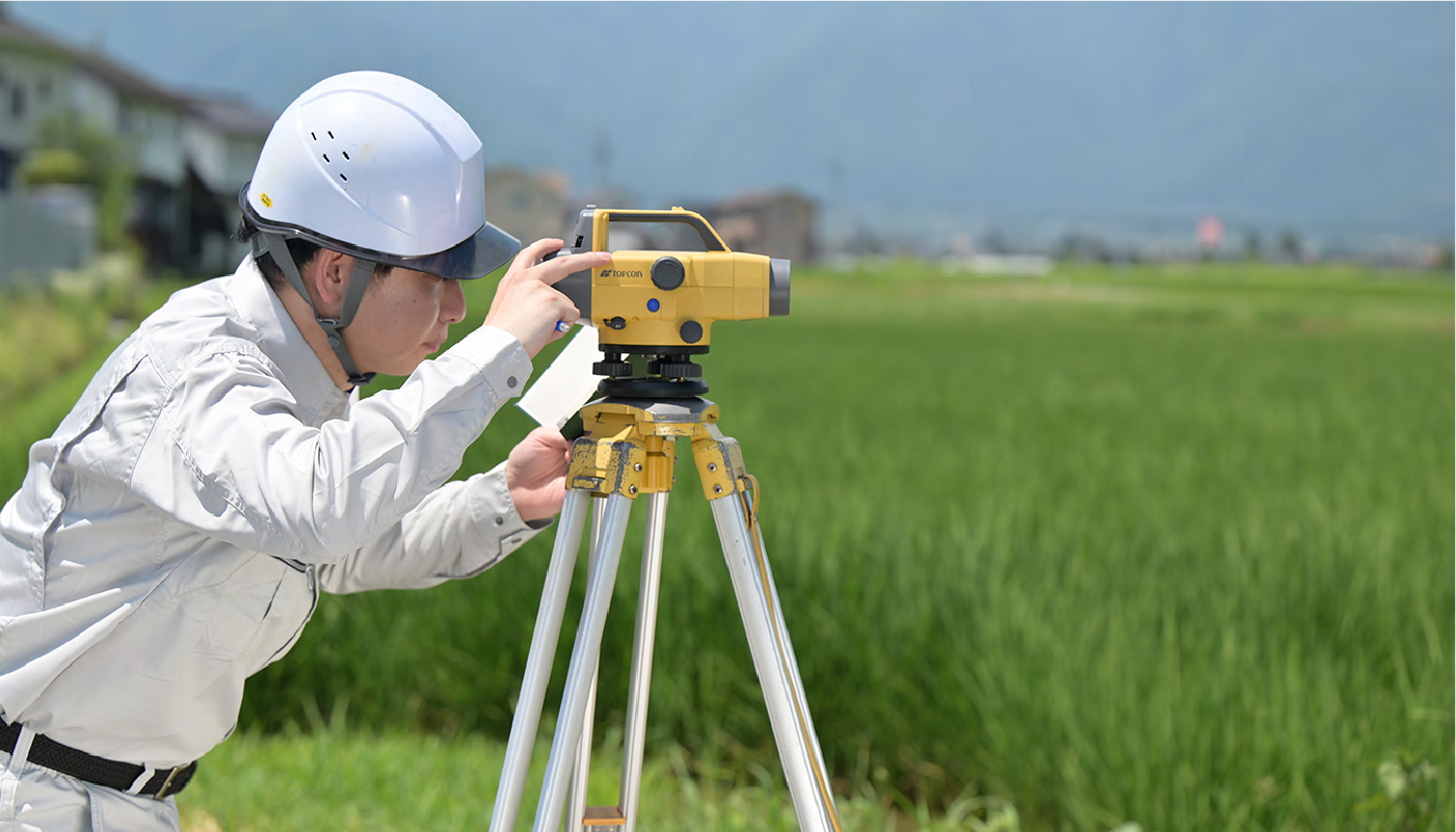 暮らしの基盤を担う「使命」。地域の発展や防災の基盤をつくる仕事だからこそ、測量・設計・補償・調査のプロによる多⾓的な視点に⽴った質の⾼い提案に定評があります。