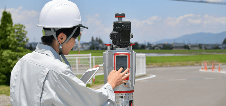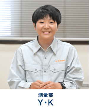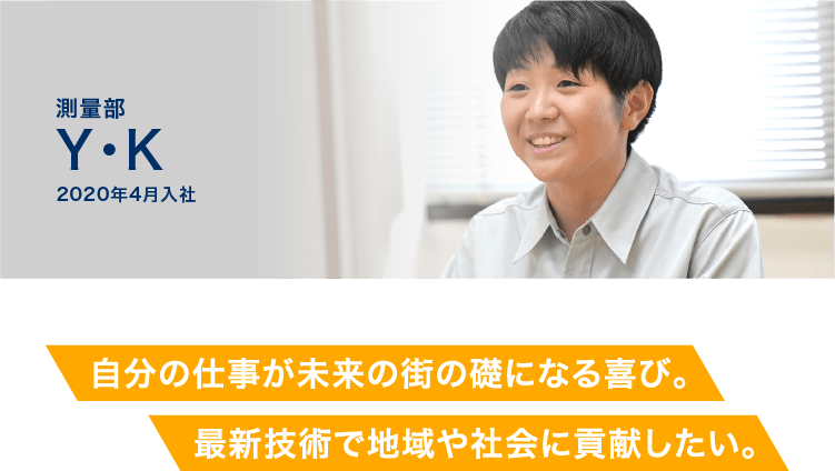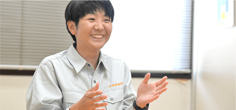 ⼤学で地理を学んでいたことから街づくりへの興味を持ち、この業界に⾜を踏み⼊れました。⼊社後は測量部に配属。現場作業にも積極的に参加しています。測量と設計は地続きのため、測量をやりながら設計に関わることもありますし、現場も道路、⽔道、⼭林…とさまざま。仕事は市や県から請け負うことが多く、インフラに関わる仕事なので、社会に貢献できることがこの仕事の⼤きな魅⼒だと思います。